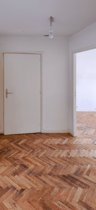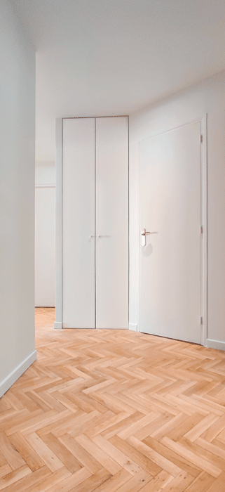 Pour lui donner une atmosphère lumineuse et accueillante, les murs ont été repeints en blanc et le parquet a été replacé, poncé et vitrifié. Cette combinaison offre une belle luminosité à la pièce, rendant l’appartement plus spacieux et chaleureux. De plus, la porte d’entrée a été repeinte en “bleu rétro”, ajoutant du caractère tout en respectant le style et l’époque de construction de l’immeuble.